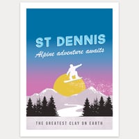 Text reads "St Dennis, alpine adventure awaits" and "The greatest clay on earth"